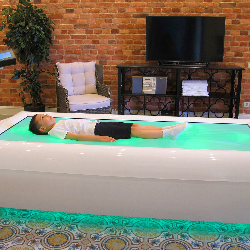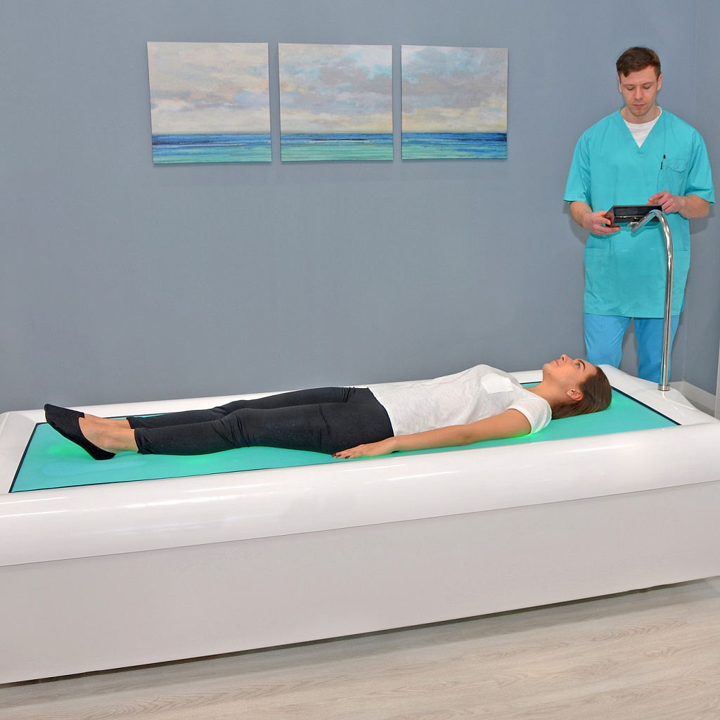 Пациент ложится на поверхность эластичной светопрозрачной мембраны, которая под его весом немного погружается в воду, обеспечивая полную анатомичность и воссоздание формы тела. Таким образом, он оказывается в состоянии «невесомости». Теплые струи воды через мембрану мягко массируют тело, усиливая релаксационный эффект. Продолжительность процедуры зависит от физического состояния пациента. В среднем, оптимальное время воздействия – 15-20 минут и рекомендуемая частота сеансов – 1-2 раза в неделю.